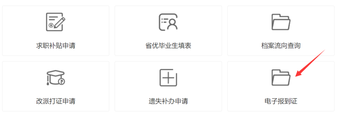 进入办事大厅,各种功能映入眼帘。有“电子报到证”、“档案流向查询”、“改派打证申请”、“遗失补办申请”等功能。纸质报到证由省级毕业生就业主管部门统一打印,最后会自动生成电子报到证,点击“电子报到证”即可查看下载。