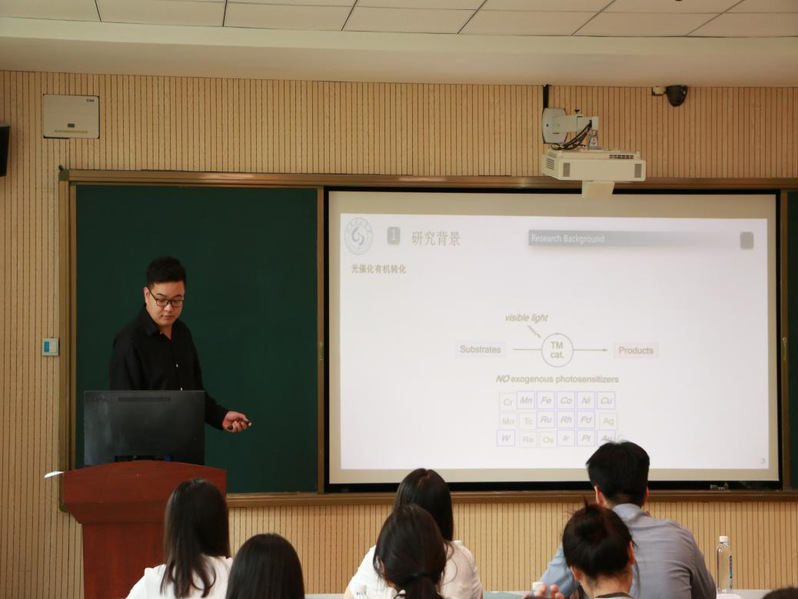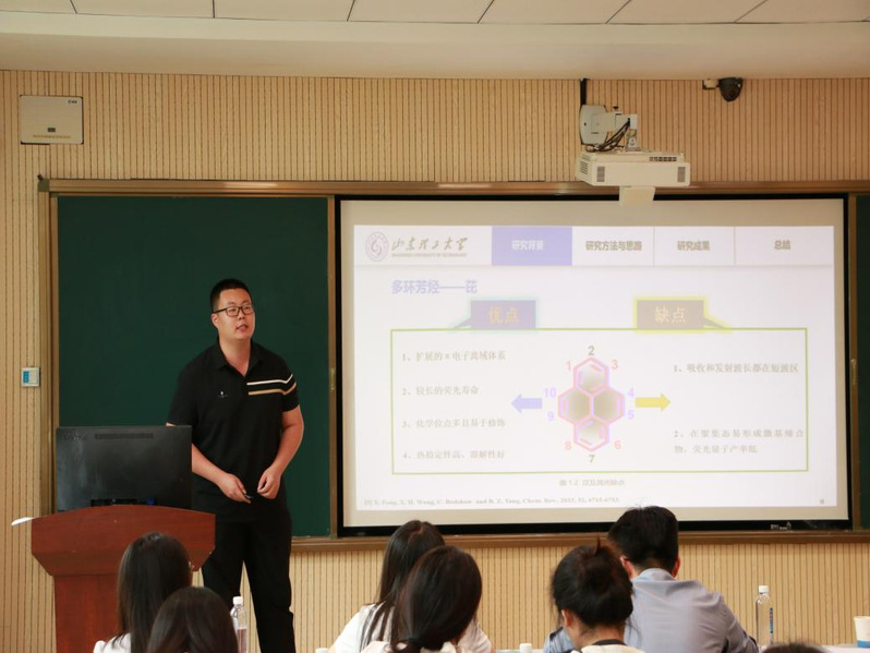 化学化工学院博士研究生孙迎港,硕士研究生冯进、李鑫隆和杨光分别作了题为“三维阵列型全共轭COF氧还原催化剂的构建”“有机非常规低维晶态结构的精确构筑及光子学应用研究”“基于主客体相互作用的超分子二聚体的构筑及其光子学应用研究”“芘基机械相应荧光材料的设计与光物理性质研究”的学术成果报告。与会师生就四位主讲人分享的内容展开了热烈的交流与讨论,积极提问,主讲人逐一给予详细解答,现场学术氛围极为浓厚。